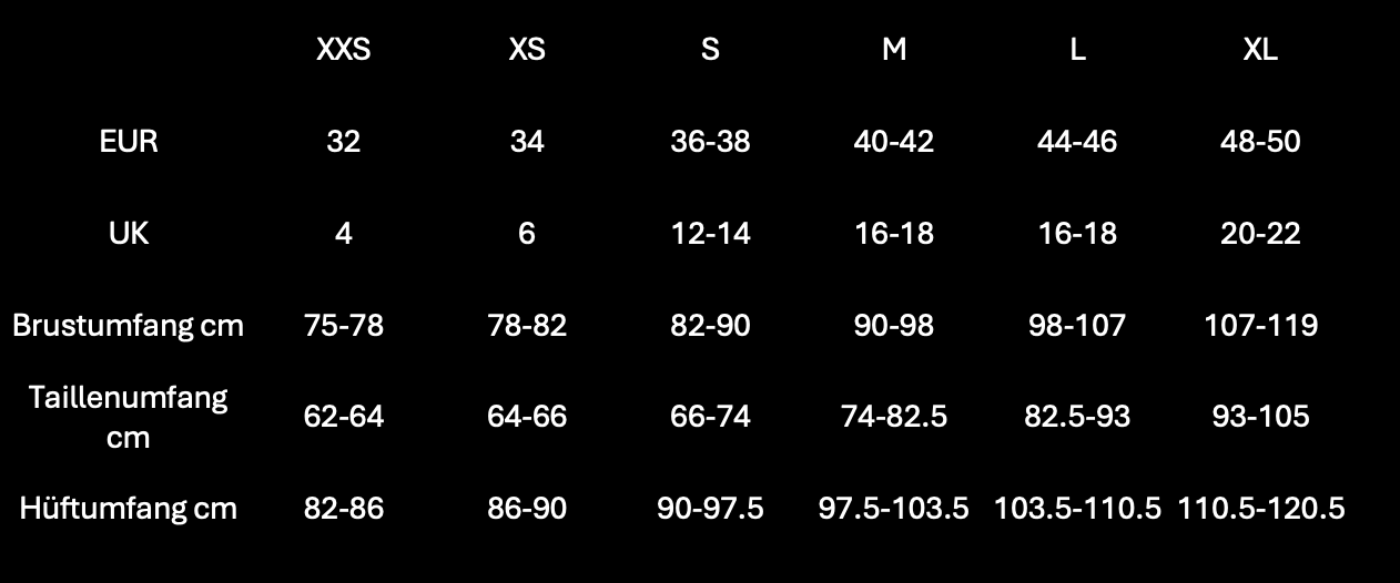 Miss deinen Brustumfang und Taillenumfang und vergleiche die Werte mit der Tabelle unten.