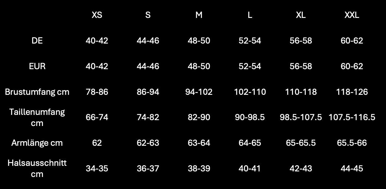 Die Maße beziehen sich auf das Kleidungsstück, flach liegend gemessen. Geringe Abweichungen sind produktionsbedingt möglich.